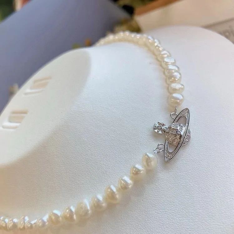 Embrace a touch of luxury and individuality with our meticulously crafted Saturn silver clasp design freshwater pearl necklace, adorned with high-luster Keshi pearls.The unique design of the saturn silver clasp adds a touch of mysterious charm to this exquisite freshwater pearl necklace.