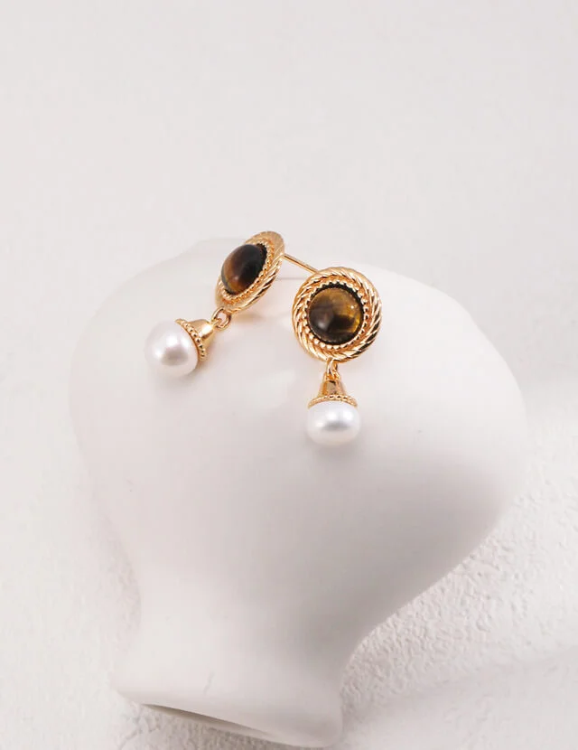 Sterling Silver Tiger Eye Stone Pearl Drop Earrings